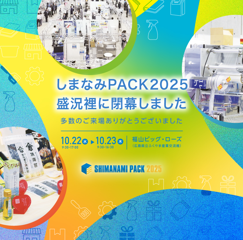 本催し「しまなみ PACK」は、フードビジネスシーンに活用される包装パッケージや食品製造関連機器類を中心とした多様な製品や情報を展示・商談できる場としております。環境問題への取組や衛生管理の必然性と食の購買変化に対する様々な利便性に対して生活スタイルが大きく変わる中で今後のパッケージや機器についてのあり方についてはその基本機能や役割においてかつてないほど注目されています。